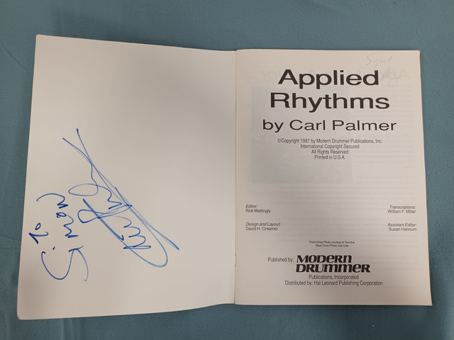 APPLIED RHYTHMS BY CARL PALMER. PUBLISHED BY MODERN DRUMMER PUBLICATIONS, INC. 1987. SIGNED BY CARL PALMER.