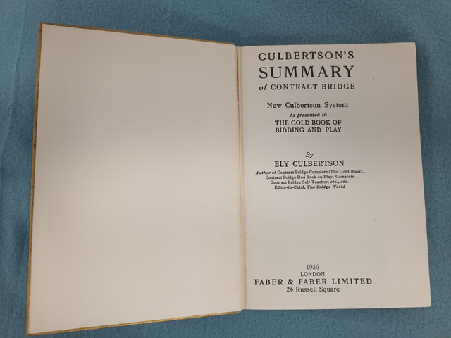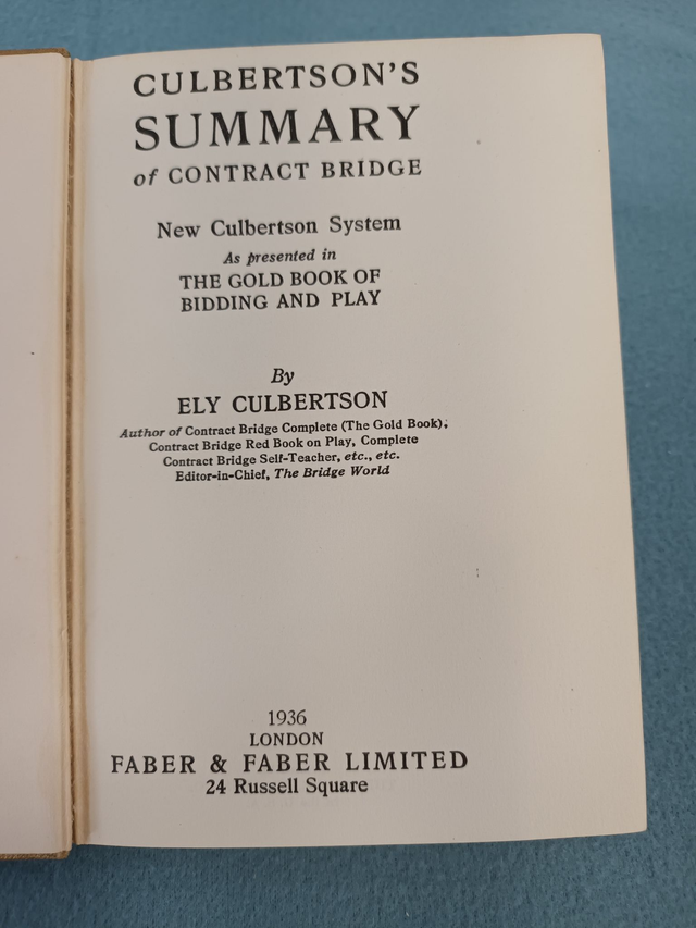 CULBERTSON'S NEW AND COMPLETE SUMMARY OF CONTRACT BRIDGE. NEW CULBERTSON SYSTEM AS PRESENTED IN THE GOLD BOOK OF BIDDING AND PLAY. BY ELY CULBERTSON PUBLISHED BY FABER & FABER 1936