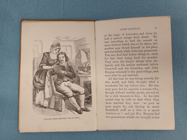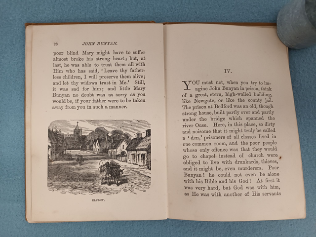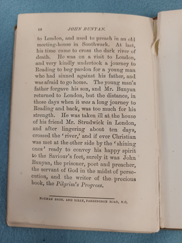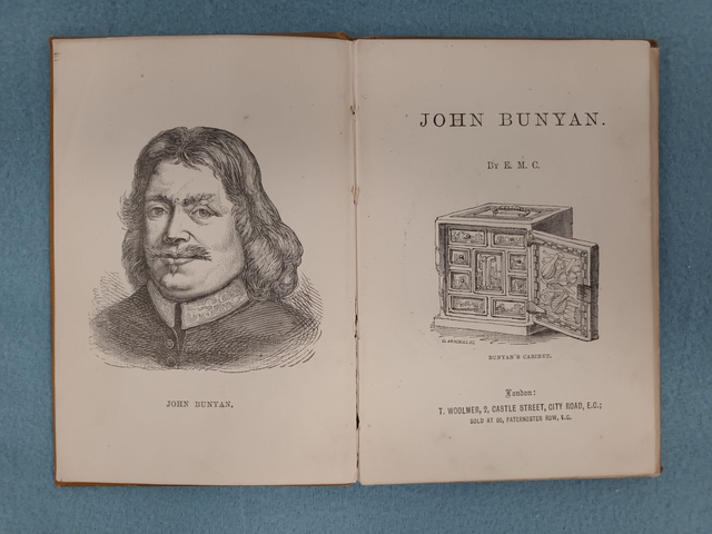 Rare and unusual little book on the life of John Bunyan, the English writer and Puritan preacher. He is best remembered as the author of the Christian allegory The Pilgrim's Progress. The little volume was written by "E.M.C." published by T. Woolmer and printed by Hayman Bros. and Lilly. It is undated, though we have a gift message, possibly from the original buyer dated August 9 1900.