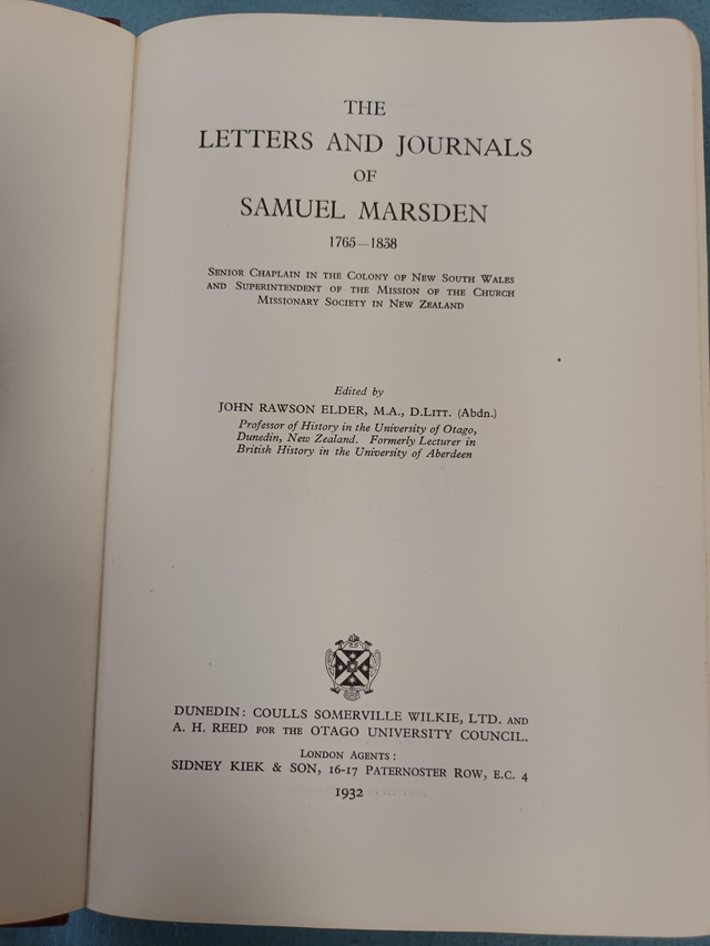 THE LETTERS AND JOURNALS OF SAMUEL MARSDEN 1765 - 1838. EDITED BY JOHN RAWSON ELDER. SIGNED BY EDITOR AND INCLUDES GIFT NOTE WRITTEN BY EDITOR.
