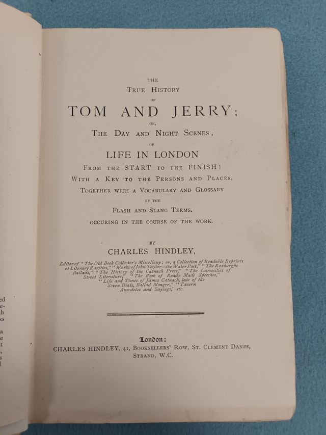 THE TRUE HISTORY OF TOM & JERRY OR THE DAY AND NIGHT SCENES, OF LIFE IN LONDON FROM THE START TO THE FINISH! WITH A KEY TO THE PERSONS AND PLACES, TOGETHER WITH A VOCABULARY AND GLOSSARY OF THE FLASH AND SLANG TERMS, OCCURING IN THE COURSE OF THE WORK. BY CHARLES HINDLEY
